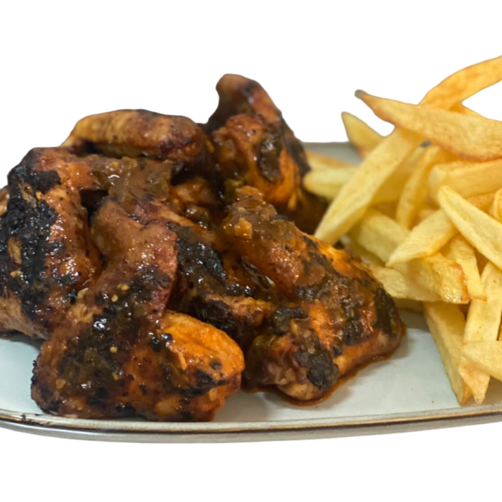 Turn up the heat with our succulent Peri Peri Chicken Wings—grilled to perfection and coated in our signature Mozambican-style peri peri sauce. Each wing is juicy, smoky, and bursting with spicy, garlicky flavour. Served with a side of hot, crispy chips and an optional dip to cool things down or turn it up!